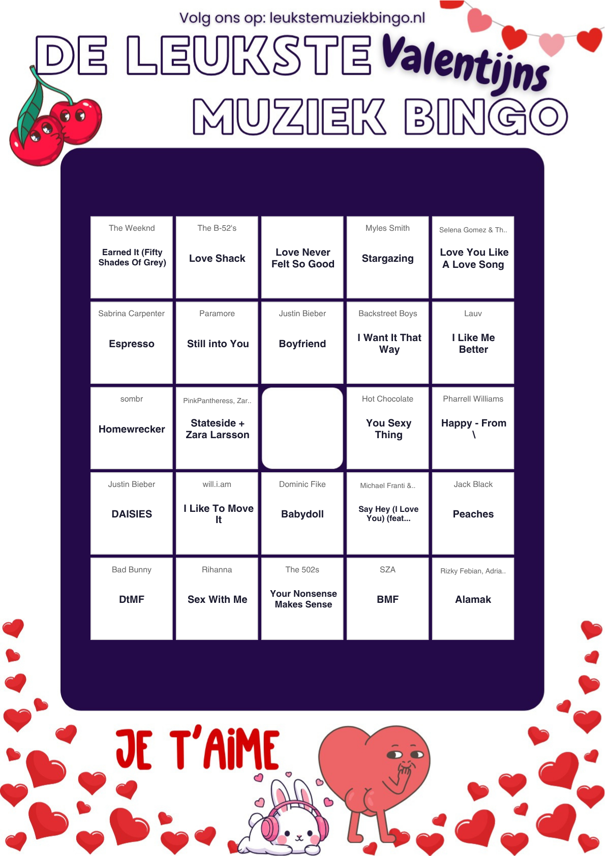 Of je nu iets organiseert met Valentijn of een themafeest geeft: deze romantische muziekbingo past altijd.